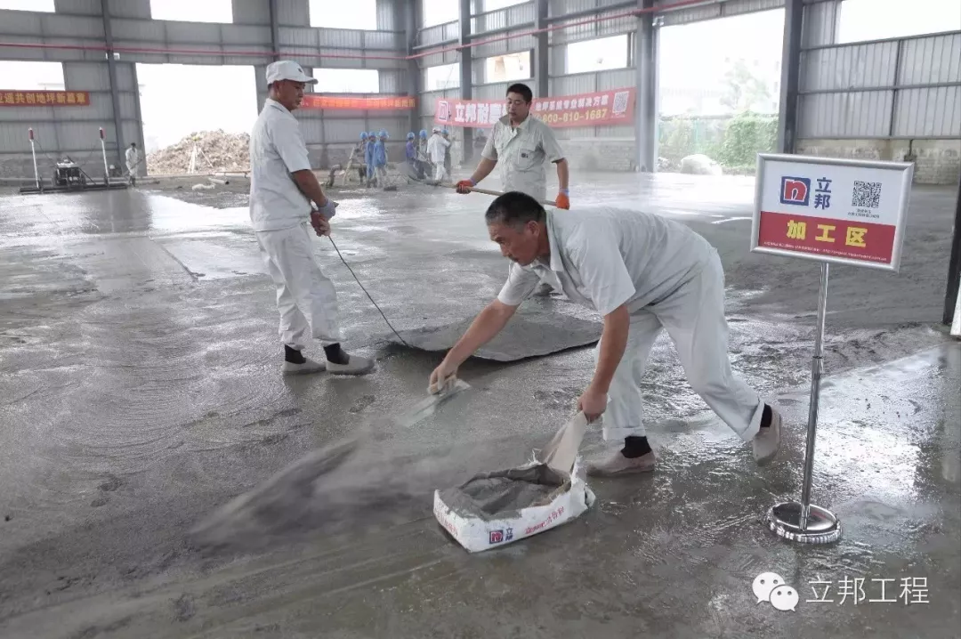 第一次拋撒建議將規(guī)定用量的 2/3 NF HARDTOP 耐磨材料均勻拋撒在剛破漿后的混凝土表面,失水較快的靠近模板,立柱,門口,墻壁,凹坑的地方應(yīng)先拋撒。