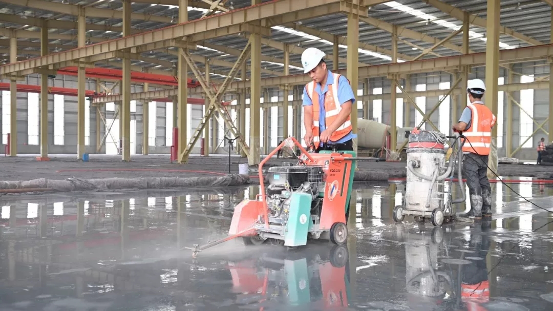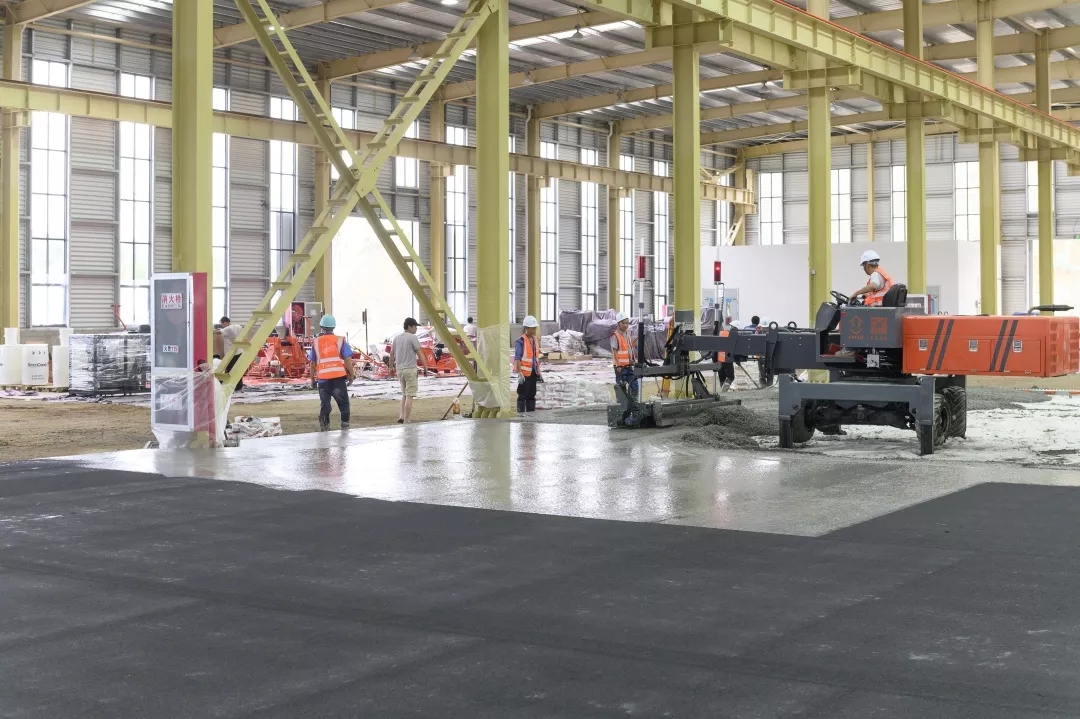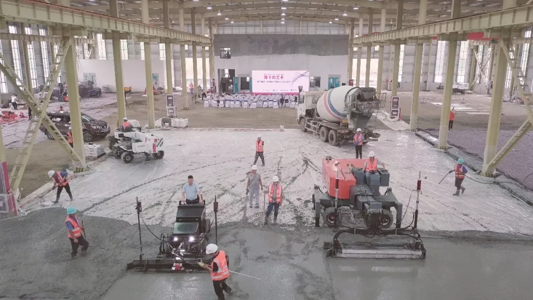 此次施工演示在亞遙即將竣工的一期廠房內,廠房地坪總面積約6000多平米。展熠工程作為施工商,使用亞遙全系列產品搭配朔馬珞STS-11M撒料機施工,材料使用科蘭T25干撒合金耐磨骨料和美爾林ML300鋼纖維,美國施貝密封固化劑。混凝土厚度20cm,現場混凝土坍落度約160mm。