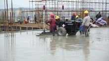 3、激光掃平儀控制砼澆注:在砼澆注之前將標(biāo)高設(shè)定在柱筋上,并將準(zhǔn)確的標(biāo)高引到激光掃平儀控制系統(tǒng),砼澆注人員刮平時將標(biāo)高控制在比設(shè)計標(biāo)高高出5—10mm范圍內(nèi),為下道激光整平機(jī)整平打好礎(chǔ)。